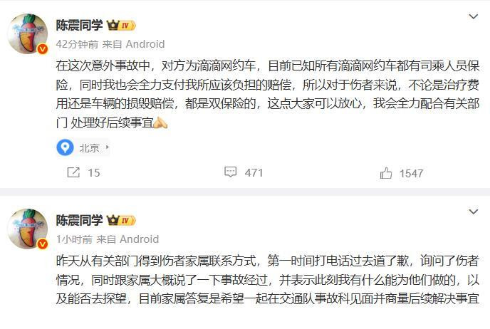 对于“京都律师”的发文,陈震表示:“再次对伤者表示歉意的同时,我方律师也会全力配合。”